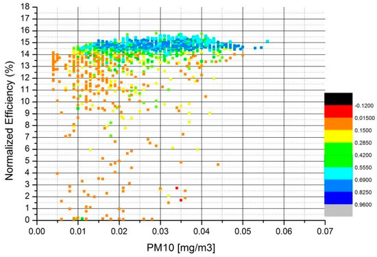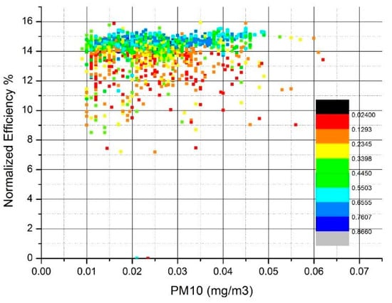 Figure 13 presents a correlation for the winter season 2018–2019. As expected, high normalized efficiency figures are associated with high values of clearness index. They are generally associated with PM10 concentrations below the levels of 40 μg/m3. Higher PM10 concentrations do not coincide with high normalized efficiency.