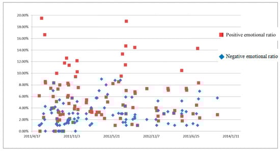 On the basis of emotional lexicon, this study analyses the emotional trend of entrepreneurial stage. We find that entrepreneurial emotion is a circular process. Figure 2 shows the ratio of positive and negative emotional words in the process of entrepreneurship. The x-axis represents the time of entrepreneurship, whereas the y-axis represents the ratio of emotional words to total words.