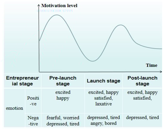 In the post-launch stage, the predictability of entrepreneurial path increases, and entrepreneurs frequently experience positive and negative emotions. Entrepreneurs adjust their emotions by controlling their entrepreneurial behaviors to perceive highly intense positive emotions. Achieving business goals is time-consuming, and assessing the progress of the goals is difficult. Thus, entrepreneurs attempt to create exciting experiences to gain positive emotions by seeking positive feedback, launching new products or services, considering the growth of enterprises and copying the behaviors in the pre-launch stage. The motivation level of entrepreneurs who can overcome negative emotions and enter the post-launch stage will rise and eventually tend to stabilize. Based on the above analysis and simulation, as well as the emotion trend in Figure 2, the trend chart of the relationship between entrepreneurial motivation and emotion is shown in Figure 3.