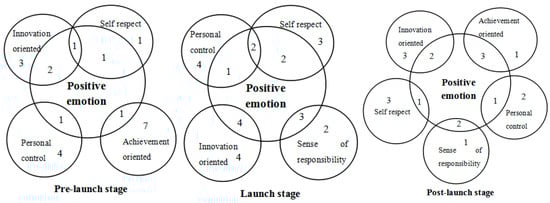 As shown in Figure 4, positive emotion can explain the formation of entrepreneurial intention to some extent, and it is different in various stages of entrepreneurship. In the pre-launch stage, entrepreneurs have high achievement orientation. However, the explanation of positive emotion is limited because this stage is highly uncertain and dynamic, even entrepreneurs with positive emotion cannot evaluate the degree of goal realization or even the goal. At this stage, the positive emotion affects the innovation orientation and self-respect dimensions of entrepreneurs. People with positive emotions are more likely to take the initiative to obtain social support and increase the recognition of social members to gain self-respect. As Du Mengjie mentioned, ‘Do something that makes my life more valuable and meaningful.’ Entrepreneurs with positive emotions can store and extract more positive information in the process of entrepreneurship and discover new entrepreneurial fields in the information []. Individuals with positive emotions have a good perception of the outside world []. When entrepreneurs find a potential opportunity, they will think that the opportunity is positive and good; hence they will be more willing to engage in innovative behaviors to promote innovation orientation. As Zhang Liaoyuan mentioned, ‘It’s a magic thing to create a place that doesn’t exist. It’s full of passion driving force before it’s started.’