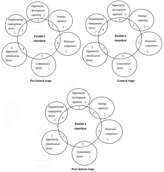 Previous studies have emphasized that entrepreneurial cognition plays an important role in the formation of entrepreneurial willingness. However, these studies are static analysis. Entrepreneurs’ behavior decision making will inevitably be affected by emotion; thus, it is based on the interaction of rationality and emotion. Accordingly, emotion plays an important role in the periodic change of entrepreneurial intention. Therefore, entrepreneurial intention should be explored in combination with entrepreneurial emotion, which will help in understanding the dynamic changes of entrepreneurial intention. On the basis of Wang Chongming’s (2004) [] classification of entrepreneurial intention, this study analyses entrepreneurial emotion and intention. To clarify the relationship between entrepreneurial emotion and intention, each dimension of entrepreneurial intention and emotion is regarded as a ‘node circle’. Amongst them, the intersection of different node circles is the number of codes that represent these node relationships in microblog or blog semantic analysis. By coding six samples, the positive emotion and entrepreneurial willingness of each stage of entrepreneurship are shown in Figure 4, and the statistical summary of reference points of entrepreneurial willingness is shown in Table 7.