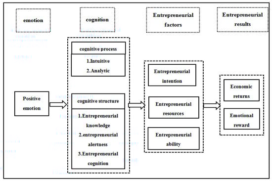 In the past, research on entrepreneurial cognition mainly focused on the results of static cognitive activities, such as the influence of cognition on entrepreneurial willingness and entrepreneurial efficacy [,] and then on entrepreneurial performance. That is, entrepreneurial cognition can explain the reasons of entrepreneurial success from the cognitive level. However, few studies on the influence of positive emotion on cognitive process are available. Although the intuitive cognitive model combines uncertainty and allows entrepreneurs to deviate from the linear path, which is different from the hypothesis of rational choice model in traditional economics, it ignores the effects of other motivations on entrepreneurs and still cannot explain why entrepreneurs and the complex cognitive process of entrepreneurs’ continuous entrepreneurship. Therefore, a comprehensive theoretical framework is further needed.