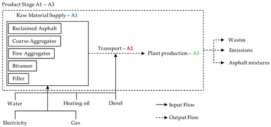 The system boundaries of the product systems under study were defined as the production of the asphalt mixtures, namely Product Stage A1–A3. This stage includes the extraction of raw materials, their transport to the asphalt mixing plant and the production of the final asphalt mixtures. The system boundaries’ definition was conducted according to the EAPA and NAPA guidelines, and the EN 15804 specifications [34,35,51]. A more detailed representation of the system boundaries can be seen in Figure 3.