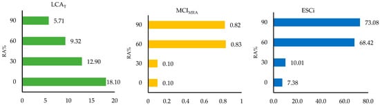 In addition, Figure 4 depicts the summarized results for the LCAT, MCIMRA, and ESCi, versus the RA% incorporated into the asphalt mixtures. For the specific case study, the higher the percentage of the incorporated RA in the asphalt mixtures, the higher their combined environmental sustainability and circularity, as end-products. This is something to be expected. Significantly fewer virgin materials are introduced into the product system, less energy is required for the heating and mixing of the aggregates and the bitumen for the production of the asphalt mixtures, and fewer materials have to be transported to the asphalt mixing plant from distant location. All these parameters are assisting towards reducing the damage to humans, ecosystems and resource availability in this way. Moreover, decreasing the utilization of virgin raw materials seems to have direct effects on the environmental performance of the asphalt mixtures. In other words, increasing the RA% within the asphalt mixtures, their aggregated environmental impacts to human health, ecosystems and resource availability are consistently decreasing. It is also noteworthy that the developed indicator is capable of emphasizing the most environmentally-friendly alternative since it can provide an enhanced discriminating criterion. This criterion is the ratio between the maximum and minimum values per alternative and indicator quantified. In other words, for the LCAT, the aforementioned ratio accounts for 18.10/5.71 = 3.17, for the MCIMRA is 0.83/0.1 = 8.3, and finally, for the ESCi the value is 73.08/7.38 = 9.9, indicating an even more rigorous discriminative aspect between the most environmentally-friendly and circular alternative, than only considering the environmental impacts and the Material Circularity Index of the asphalt mixtures separately.