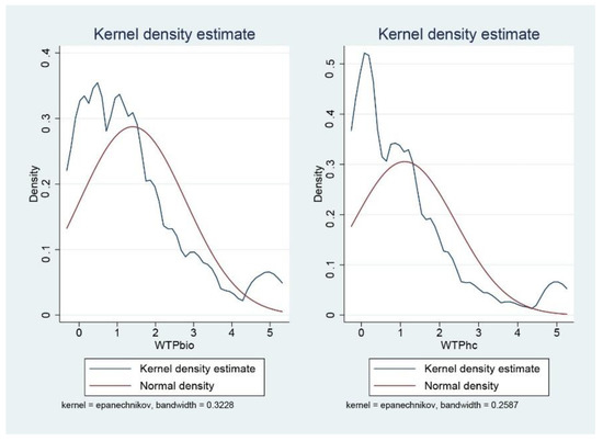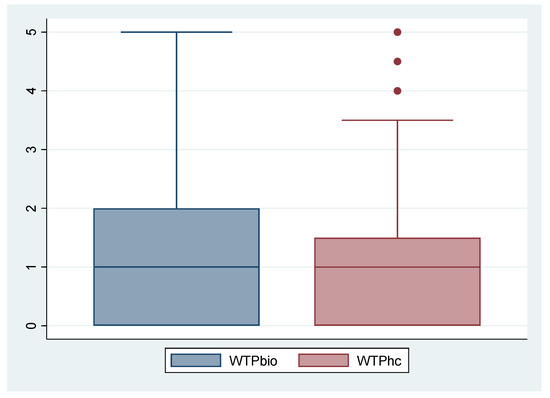 The averages of the price premium for the two types of EVOO were calculated. The willingness to pay a price premium for organic EVOO (WTPbio) is €1.405, while that for functional EVOO (WTPhc) is €1.109 (Table 8). Figure 1 and Figure 2 show WTPbio and WTPhc Kdensity and box-plot.