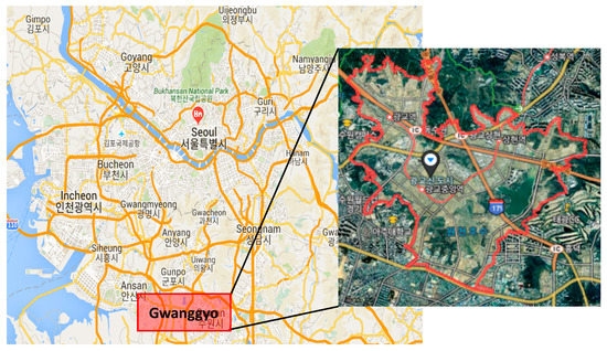 While previous real estate optimization studies [19,20] were based on artificial examples on investment amount, return on investment, the evaluation score for a urban regeneration project, etc., this study focused on a real-world case of a new town project in South Korea. We planned to find a optimal public housing investment combination to maximize the amount of public rental houses in Gwanggyo, which is one of the second-stage new towns. Gwanggyo new town is a planned city surrounding part of Suwon city and part of Yongin city. It is located 25 km south from Seoul, as shown with a red rectangle in Figure 1. In 2004, Gwanggyo new town was designated by Gyeonggi Province, Suwon city, Youngin city, and by a local-government-owned real-estate company named Gyeonggi Urban Innovation Corporation (GICO). Gwanggyo new town, which will accommodate more than 31,000 households, was not only intended for the purpose of providing increased housing supply but also for several regional purposes such as a local-government office, convention center, and commercial zone.