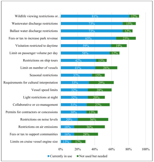 Regulations for cruise-ship tourism in Marine World Heritage sites. Site representatives indicated which regulations are currently in use (blue), or not used, but needed (green). The graph is organized in order of regulations most to least frequently currently in use.
