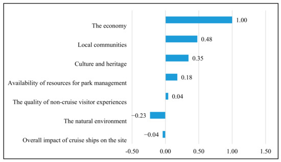 We asked survey respondents how cruise-ship tourism affects different attributes of their site, and the overall impact of cruise-ship tourism on their site. For each attribute, respondents could indicate that the effects of cruise ships were very positive (score of 2), positive (1), neutral (0), negative (−1), or very negative (−2). Based on the average of all responses across sites, we found that the most positive impacts were on the economy (score of 1.00), local communities (0.48), culture and heritage (0.35) and the availability of resources for park management (0.18). The natural environment was the most negatively affected site attribute, with an average score of −0.23. On average, site representatives indicated a nearly neutral overall impact of cruise ships on their site (−0.04) (Figure 2).
