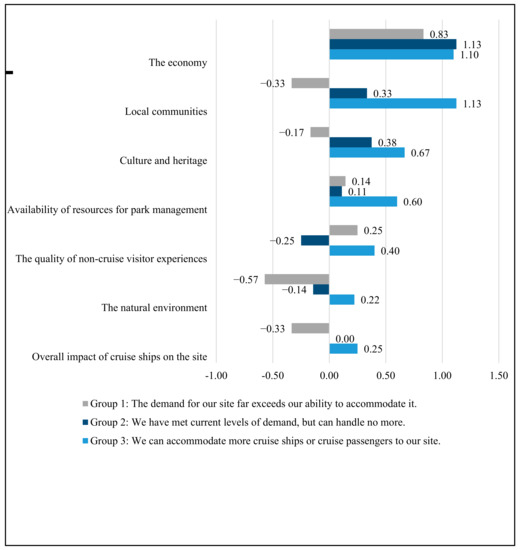 For each group, we found the average value for the question regarding the overall impact of cruise ships on MWH sites. Results suggest that sites’ economies were seen to benefit from cruise-ship tourism for all groups. However, there were discrepancies in the direction of the effects of cruise-ship tourism on nearly all other site attributes. In general, Group 1 (demand exceeds ability to accommodate) rated the effect of cruise-ship tourism on local communities, culture and heritage, the natural environment, and the overall impact on the site negatively. Sites in Group 3 (can accommodate more cruise-ship tourism) rated the effect of cruise-ship tourism on all attributes as positive, on average. Average responses for Group 2 were mixed, but mostly positive (Figure 3).