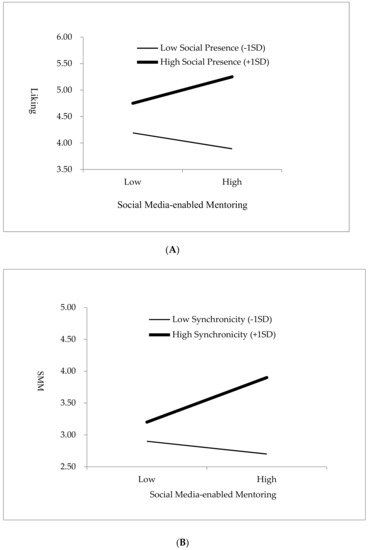 We use moderated regression analysis in SPSS to test whether social presence moderates the effect of social-media enabled mentoring on liking; and whether synchronicity moderates the effect of social-media enabled mentoring on SMM. Results (see Table 5) show that social presence significantly moderates the effect of social-media enabled mentoring on liking (β = 0.20, p < 0.01). In addition, synchronicity significantly moderates the positive effect of social-media enabled mentoring on SMM (β = 0.23, p < 0.01). Thus, H2 and H5 were supported. As explorative analyses, we found that synchronicity doesn’t moderate the effect of social-media enabled mentoring on liking (β = 0.02, ns.); and social presence doesn’t moderate the effect of social-media enabled mentoring on SMM (β = 0.12, ns.). To interpret the interactions, we plotted the interactions (see Figure 2A,B) and examined the simple slopes. The positive relationship between social media-enabled mentoring and liking was significant only when social presence was high (b = 0.16, p < 0.05) rather than when it was low (b= −0.09, ns.). The positive relationship between social media-enabled mentoring and SMM was significant when synchronicity was high (b = 0.26, p < 0.01) rather than when it was low (b = −0.03, ns.)