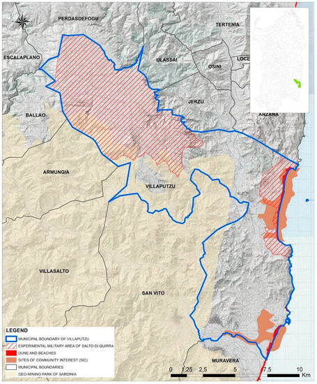 The municipality of Villaputzu covers about 181.25 km2 and is the most affected by the MPGSQ, with about 41% of the land area occupied by military easements. Furthermore, the MPGSQ at sea falls within a site of community interest (SCI) classified with code ITB040017 ‘Ponds of Murtas and S’Acqua Durci’ [26] as in Figure 5.