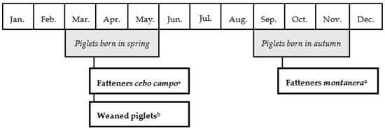 Calendar of traditional Iberian pig production with the extensive system. Destination of piglets according to the season of birth. a Fattening the next year; b Sale after weaning.