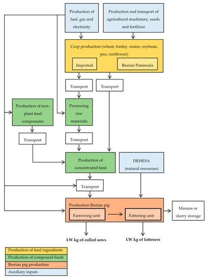 In the Southwest of Spain, Iberian pig is an autochthonous breed raised in the ecosystem called dehesa. Dehesa is defined as open oak forests with ground cover of herbaceous species and sparse shrubs []. Extensive production and the use of natural resources by Iberian pigs in dehesa generate high quality foods, mainly dry-cured meat products []. Consumer’s perception of this livestock production system (pigs raised outdoors) is positive when compared to conventional systems []. The use of natural resources may be exclusive (montanera) or partial (cebo campo) during the fattening period. We hypothesized that pig production systems highly relying on natural resources like traditional Iberian system with fattening in montanera presented lower environmental impacts than systems like cebo campo that depend more on compound feeds.