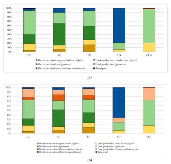 Figure 3a shows the contribution of the different stages of Iberian pig production to environmental impacts in the farms with animals fattened only in montanera. Growing stage showed the greatest contribution to CC, AC, EU and CED whereas the finishing period contributed to LO the most. The impacts of the growing period and of the production of piglets were caused by both on-farm emissions and feed production, whereas feed production for finishing pigs did not contribute to the impacts since no feed was supplied for fattening in montanera. Contribution of transport was low in all environmental impacts (between 0 and 2%).