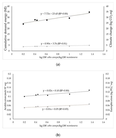 Potential environmental impacts of pig production. (a) acidification (♦) and eutrophication (●), (b) cumulative demand energy (■) and climate change (▲) according to the type of fattening expressed as the ratio between the production made in cebo campo system and the production made in the montanera system. The kilogram of live weight (LW) is plotted on the x-axis.