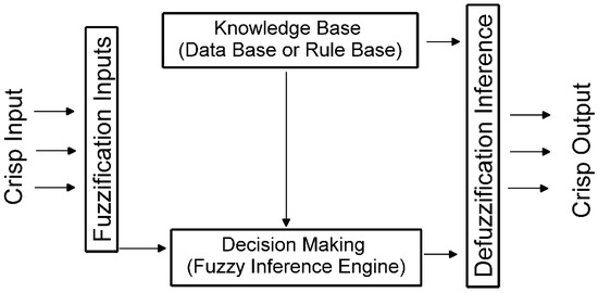 Fuzzy logic systems comprise four basic mechanisms, which are the fuzzification inference, knowledge base (also known as rule base or database), decision-making (called inference engine or inference mechanisms as well) and defuzzification [47,48]. The relation of these components is represented schematically in Figure 1, involving fuzzy logic operators, membership functions and fuzzy rules. The membership functions allow for the demonstration of a membership grade to a fuzzy set for a given number related to a linguistic label. Furthermore, the fuzzy ‘if-then’ rules present expert knowledge, which can be easily computed [47,48].