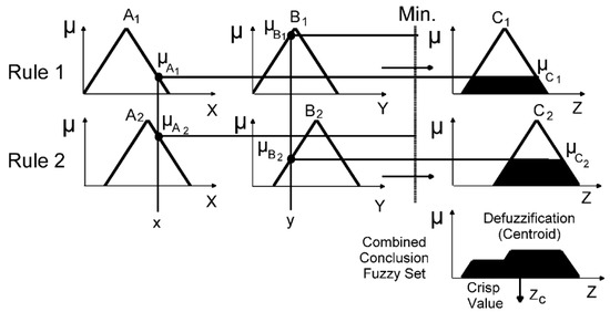 The fuzzy inference unit (alternatively, the decision-making or inference mechanism) applies a fuzzy reasoning procedure to obtain a fuzzy output. Thus, it combines the findings of the fuzzification process in a single fuzzy output for each instruction. Many fuzzy inference systems exist. However, a very frequently applied inference system is the Mamdani inference system (Figure 2) [47,48].