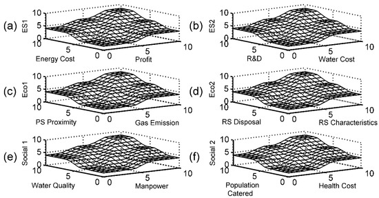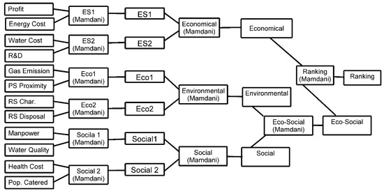 The left-hand part of Figure 4 highlights the implementation of the first phase models grouping the twelve indicators under a specific area. The models of this stage output the performance scores of the works under each domain. The second stage function aims to appraise and consolidate presentation scores of each area into two variables acting as inputs to the last ranking model. The classification of indicators into domains determines the number of models in the second stage. The third phase comprises of one fuzzy model, whereby the output provides the last ranking mark (Figure 4). Therefore, the scores of specific desalination plants can be utilized as a sustainable performance ranking system between each plant by water authorities or the decision-makers according to relevant scenarios.