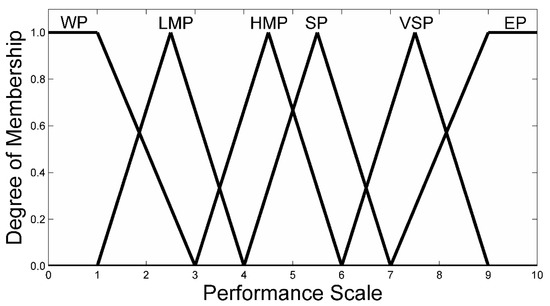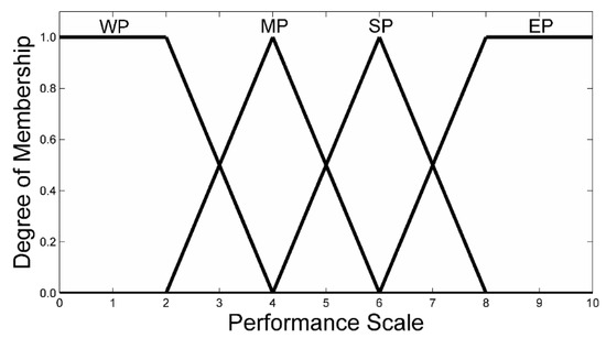 The membership functions for the inputs of the initial phase split the range (1–10) into four fuzzy sets with differing linguistic variables; namely, weak performance (WP), moderate performance (MP), strong performance (SP) and excellent performance (EP). Figure 5 schematically represents the membership functions of the input and output of the first stage.