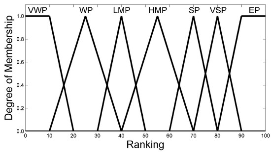 The membership function input mechanism in the third stage replicates the findings of the second stage; i.e., the six fuzzy sets of the membership function described, previously. The final phase is an integration of the three areas and offers the last crisp score for the plant under appraisal, consequently, the output range is 1–100. The quantity of membership functions needed to encapsulate all options of plant performance increases by one to seven, which has been presented in Figure 7, with the seven linguistic variables tagged as very weak performance (VWP), weak performance (WP), low–moderate performance (LMP), high–moderate performance (HMP), strong performance (SP), very strong performance (VSP) and excellent performance (EP).