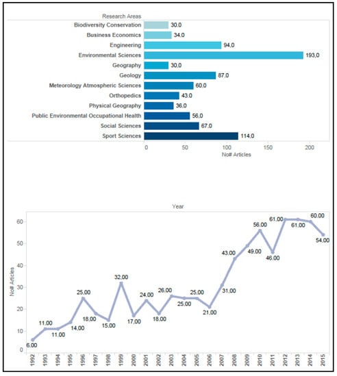 In recent years, interest in efficient snowmaking systems in ski areas has become increasingly powerful, and many studies are being conducted by researchers worldwide. According to the results obtained from the query of the Web of Science database (WoS), using the keywords “ski area”, 851 ISI articles have been published in recent years. Most of these address areas such as environmental sciences (193 articles), sport sciences (114 articles), geology (87 articles), and geography (30 articles). The following figure illustrates the most relevant research areas of the articles published in ISI journals and the number of published papers according to year. It can be observed that recently, the number of published ISI articles have significantly increased, the year of 2013 representing the apogee in terms of interest for this domain (Figure 1).