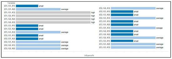 For the output variable, the output Fuzzy range is determined by the Fuzzy rules base and Fuzzy inference operators; as well as by the expert assessments, being divided into three categories: small (OFR1), medium (OFR2), and high (OFR3). For a complete definition of the Fuzzy set using the input variables, the following triangular membership function was established.