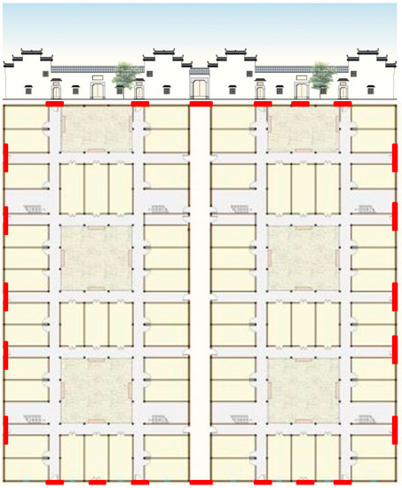 Moholy-Nagy defines space as “the relationship between the positions of objects”, indicating that it can be experienced by all human senses. Emphasizing that space is a dynamic field and architecture is no longer an exhibition between individuals, but a building group relationship: the group edge line becomes a kind of fluid; space has fluidity and it is a series of innumerable relation sequences [6]. Three san-ho-yuans are connected with each other by corridors, thus preventing people from getting wet during the rainy season when they walk through the buildings (Figure 5). The Ma Tau Wall, made of grey bricks, plays a decorative role on the one hand, and has the function of fire prevention on the other hand. The first floor has stone windows with small openings, while the second floor has round windows with only one head protruding out. San-ho-yuans are connected to form a closed space, surrounded by a wall with a height of 5–6 m. Open doors in the east, west, north and south form a large enclosed courtyard. It can be seen from the elevation and plan of the building (Figure 6), that when the door is closed, the inside and outside are separated to prevent theft and attack. The closed courtyard can play a role in security.