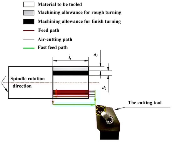 When the total volume to be tooled is fixed, the allowance distribution of different machining phases can be crucial to meet the production demands. Figure 2 shows the machining allowance distribution of a typical cylindrical turning process with rough turning and finish turning. is the total axial length of the workpiece to be tooled. and are the radial distance of the workpiece for rough turning and finish turning, and they are taken as the machining allowances of the two turning phases.