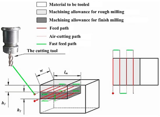 Similarly, Figure 3 shows the machining allowance distribution of a typical step milling process. is the length of the workpiece to be tooled, is the width, and are heights of the workpiece for rough milling and finish milling. Therefore, the total workpiece volume to be tooled in a milling process can be expressed as Equation (2):