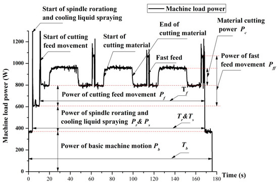 According to our previous work [27,28], the energy consumption objective during a machining process with a fixed group of machining parameters can be approximately expressed as Equation (3). is the lasting time of feed movement, is the lasting time of cutting materials. Figure 4 shows the power profile of a typical milling process: