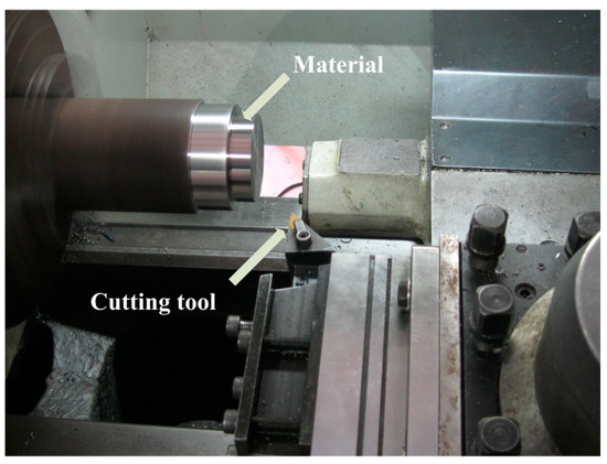 The first case is a cylindrical turning process carried out on a CK6153i lathe cutting C45E4 carbon steel, using VNMG160408-YBC351. Figure 6 shows the real scene of the cylindrical turning process. Table 3 shows the geometrical parameters of the cutting tool.