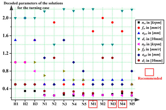 Therefore, by introducing the modeling results above, namely Equation (3), Equation (11), Equations (19)–(22), into Equation (24), the machining allowance distribution with MOP of the machining parameters for a cylindrical turning process are expressed from Equation (25) to Equation (30), where , , , , , are the normalized objective values to be optimized during the rough turning or the finishing turning phases.
