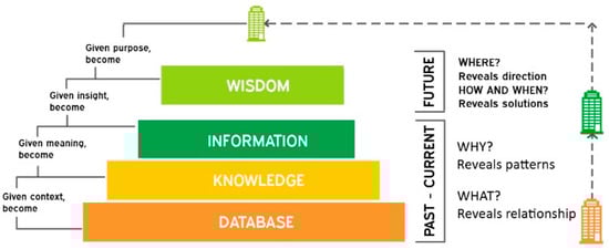 The fourth step is arguably the most elusive of all these four elements and concepts. Wisdom is the highest level of abstraction, with vision foresight and the ability to see beyond the horizon. The Awad and Ghaziri’s definition of wisdom [27] is well suited to the W-step of the ALDREN approach, providing a vision foresight with the ability to communicate with core indicators—derived from the raw data of the first step—the path to follow per a specific non-residential building, the so called ALDREN renovation roadmap, and describing clearly “when, where and how renovate” buildings to reach the NZEB target (Figure 2). Looking at the DKIW through the eyes of the ALDREN approach, it means providing concrete replies to a series of questions related to the building renovation process leads to concrete decisions and actions, increasing confidence in the investors/decision makers/owners. This is the added value of the ALDREN data model, because without actions, there is little sense in gathering, capturing, understanding, leveraging, storing, and even talking about data, information, and knowledge.