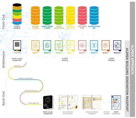 The ALDREN approach, and the outcomes presented in this paper reflect the structure of the activities carried out during Task 2.6 of WP2, the technical work package of the ALDREN project composed of six tasks: four vertical (sectorial) tasks (T2.2 Energy rating and target, T2.3 Addressing the gap between calculated and actual EP; T2.4 Addressing health and well-being, and T2.5 Linking EVCS to the financial valuation), harmonized by a common language defined in the first horizontal task (T2.1) and integrated by an overall approach—the second horizontal one (T2.6)—into a Building Renovation Passport (BRP).