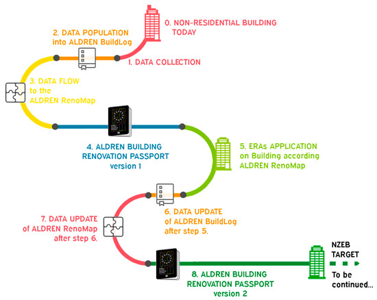 The beginning of the process represents the up to date conditions of the non-residential building (step 0) and it is followed by the data collection (step 1). Once collected, all the data will be populated into the ALDREN BuildLog (step 2), which is automatically connected with the RenoMap (step 3) sharing some parameters and indicators as input-output between the different sheets of the ALDREN BRP (step 4). At this point, the owner or investor could apply the ERAs individuated within the RenoMap (step 5) and once the renovation actions has been applied, the ALDREN BRP data has to be updated both in ALDREN BuildLog (step 6) and also in the ALDREN RenoMap (step 7) and consequently a version 2 of the ALDREN BRP will be generated (step 8). The process will last through the time with the final target of NZEB for the building.