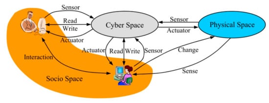 The evolution and continuing advancement in research and development of technologies over the past decade influenced significant increase in the interest around complex computer systems development. A domain which drew a lot of interest is the area of Cyber–Physical Systems (CPS). CPS are computer systems employing integrated computational and physical capabilities such as sensing, communication, and actuation to physical world, with a focus on the integration of physical and information systems [39]. Such systems are commonly found in the industry for manufacturing, environmental, process and security control, aviation systems, smart structures, and many other domains [40]. However, CPS are missing the element of human interaction and social input, solely focusing on the integration of the computational with the physical world. Humans learn and interact in socially constructed ways. Hence, if CPS are used to improve and enhance the quality of human life, the creation of a “cyber-physical society, which already includes human, social, cultural spheres as well, above the physical and cyber spaces” [41], p.11 should then be considered. Incorporation of the human factor together with CPS is becoming a research trend and is referred to as Cyber–Physical–Social Systems (CPSS). A CPSS is a complex system constituted by a physical system, its social system including human beings, and the cyber system that connects them [42]. The CPSS is an extension of the CPS, with emphasis on the human factors influencing the system [43]; in simple words, a CPS connects the physical world to the cyber world, while a CPSS introduces the connection of the social world [44]. Figure 1 illustrates a simple yet complete CPSS where remote users can interact with the cyberspace, the physical space, and with each other through a system supporting read-and-write actions and comprised of sensors and actuators. Each user’s behaviour and social interaction are being communicated back into cyberspace, enabling the system to develop an individual profile of their social characteristics and relations, rather than simply collecting information about user activities based on sensor data. Users can interact and change physical objects in the physical space using actuators, and the updated information is fed back into the cyberspace to reflect the current situation. Also, the status, interests, and knowledge of the user evolve as they navigate and engage in social interactions in cyberspace.