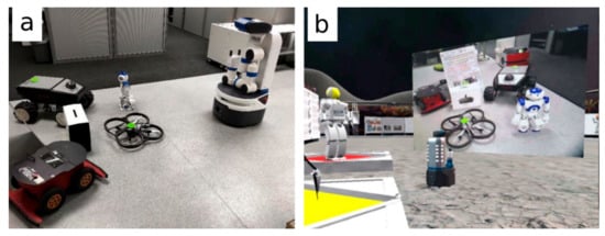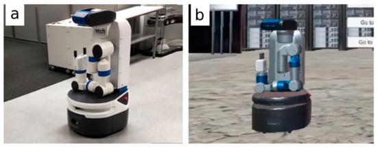 Fetch54 is a mobile manipulation robot from Fetch Robotics [52] designed to be the standard platform for the next generation of mobile manipulator applications [53]. It provides a high-resolution camera, laser scanning, multiple sensors suitable for perceiving objects, navigation, and manipulation in dynamic environments, and a mechanical arm designed to be able to reach and grab items. Fetch is placed in one of the exhibition areas of the host University. The area has been scanned and mapped using Fetch’s laser scanning technology, and a C++ application to identify predefined locations in the real space was developed, where Fetch should navigate when instructed by users through the virtual environment. The Virtual Fetch is synchronised with the real Fetch’s movements and actions and provides live video feed of the real world. An example is depicted in Figure 4. The image on the left features a view of the real world where Fetch robot is looking at the different robots and other equipment that are placed in its front. The right side of the figure shows a screenshot of the virtual environment where the Fetch digital twin can be seen, together with a plane object attached to its front that shows the camera feed directly from the eyes of the robot. When Fetch is moving in the real world, then its digital twin is synchronously moving and replicating its movement in the virtual environment.