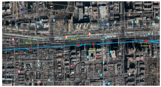 Location of 2nd Ring Road from detector 1 to 4 (Google Map). (Note: the Chinese words in this map are just the name of some buildings (residential, temples etc.) and will not affect the meaning of this image).
