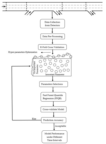 In FFQR, traffic prediction problem could be formalized as: let be a measured value vector containing traffic measurements from a point of traffic network indexed by at time . The vector could have travel speed component measured by a specific loop detector indexed by . The datasets further divided into three sets, training, validation, and testing. Firstly, the training procedure uses two sets, whilst the third sets evaluates the capacity of predicting trained FFQR. In the RF, predicted outcomes for , new data samples resulting from predictors, , are modelled as a weighted average of responses , training data samples, with weights given in Equation (1), [77]. In particular, we consider the conditional distribution function (in Equation (2)) of response variable conditioned on the specific values of the predictor variable .