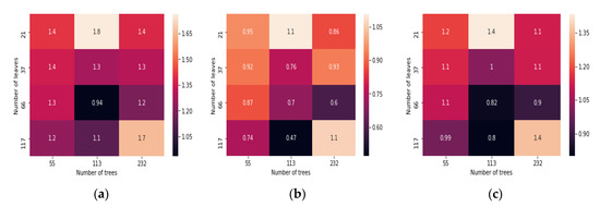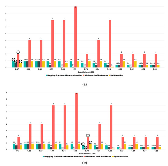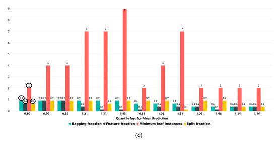 Figure 7a depicts the impact of minimum leaf instances, bagging fraction, split fraction, and feature fraction on quantile loss for 0.95 interval, which was achieved when the quantile loss was 0.47. The values achieved for minimum leaf instances, bagging fraction, split fraction, and feature fraction was 2, 0.9, 0.6, and 0.6, respectively. Figure 7b,c indicate the quantile loss for 0.07 interval and mean prediction, which was obtained for 0.94 and 0.80, respectively. The obtained values of 0.07 quantile for minimum leaf instances, bagging fraction, split fraction, and feature fraction were 2, 0.6, 0.9, and 0.1, respectively. Similarly, Figure 8c shows the achieved values of mean prediction for minimum leaf instances, bagging fraction, split fraction and feature fraction were 2, 0.9, 0.6, and 0.6, respectively. In Figure 7a–c, the encircled values show the values of the best-tuned parameters for mean prediction with less quantile loss, which was obtained for 10-fold cross-validation.