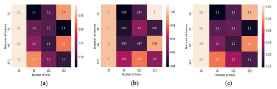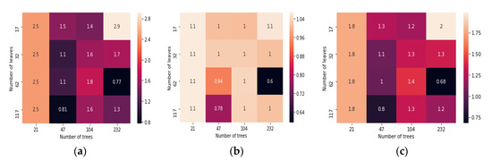 The hyper tuning parameters included for mean prediction, 0.07 quantile interval, and 0.95 quantile interval are the number of trees, number of leaves, minimum leaf instances, bagging fraction, and feature fraction. Figure 4 shows the quantile loss of detector 4 for 15 min prediction horizons, which are number of trees and a number of leaves. The quantile loss obtained for the mean prediction, 0.07 quantile, and 0.95 quantiles were 0.8007, 0.471, and 0.94, respectively. Figure 5 presents the detector 4 quantile loss for 10 min prediction horizons which were obtained for mean prediction, 0.07, and 0.95. The achieved values for a number of trees and the number of leaves is 0.68, 0.77, and 0.60. Similarly, Figure 6 indicates the quantile loss of detector 4 achieved for 5 min prediction horizons for mean prediction, 0.07, and 0.95 were 1.1, 1.4, and 0.84, respectively.