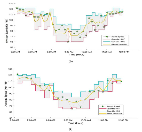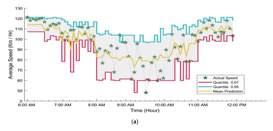 Figure 8 shows the predicted trends measured for detector 4 under different time intervals during morning peak hours and off-peak hours. It also indicates the actual mean prediction, 0.07, and 0.95 quantiles for 5, 10, and 15 min prediction horizons. We find that mean travel speed prediction, 0.07, and 0.95 quantiles were close to the actual speed data in the period of off-peak between (6:00 a.m. to 7:30 a.m. and 10:30 a.m. to 12:00 p.m.). In addition, results showed that the prediction accuracy for off-peak hours (normal time) is better than the peak hours’ period because the traffic flow is more stable during normal time than the peak time.