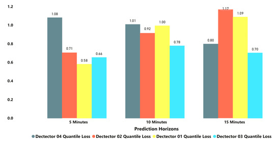 The impact of data collection time intervals on the prediction of short-term travel speed accuracy is essential. FFQR was used to predict short term travel speed at different time intervals (i.e., 5, 10, and 15 min). The quantile loss of mean prediction for data collected in different time intervals from different loop detectors can be seen in Figure 9, which shows a similar trend for detector 3 and detector 4, as time-horizons increased the quantile loss decreased. It can be observed from Figure 9 that the proposed FFQR yielded robust travel speed prediction outcomes with varying time-horizons, particularly at larger time intervals. The prediction accuracy increased for increasing the time intervals, as shown in Figure 9. The model performed better as shown in Table 2 and Table 3 with lower quantiles loss and RMSE for loop detectors at different time intervals, demonstrating the traffic speed pattern characteristics over time. For example, the mean quantile loss and RMSE for all loop detectors for time intervals of 10 min are 0.941 and 11.26, respectively. In contrast, the mean quantile loss and RMSE for all loop detectors for time interval of 15 min are 0.93 and 10.73 respectively. Despite the sophisticated and complex road conditions in the empirical test, model performance remained entirely satisfactory. The decrease in these two indicators, quantile loss and RMSE, indicated the improvement in the short-term speed prediction. Further, it may be noted from the results that the suggested model yielded desirable travel speed prediction results with low RMSE. These results are indicative of the fact that increasing the time interval for data collection could reduce traffic uncertainty, therefore the speed pattern is more stable and also predictable [79]. Additionally, the higher accuracy relationship with increased time intervals for data collection is aligned with many other legitimate prediction approaches [80]. Similar studies conducted suggest that prediction accuracy is inversely proportional to data collection time-horizons. For example, in a study the accuracy obtained (in term of RMSE) for traffic speed prediction using Elman NN for 1 min and 4 min were 10.79 and 12.92, which was less reliable relating to our obtained prediction accuracy for different time-horizons [32]. In addition, researchers have compared various models such as SVR, ANN, bayesian regularized neural network (BRNN) and SARIMA to forecast short-term speed and achieved prediction accuracy estimates comparable to our proposed method. In these studies, authors have demonstrated the predicted travel speed trend during off-peak hours and peak hours of the day and captured traffic nonlinearity in arbitrary time horizons [81,82,83].