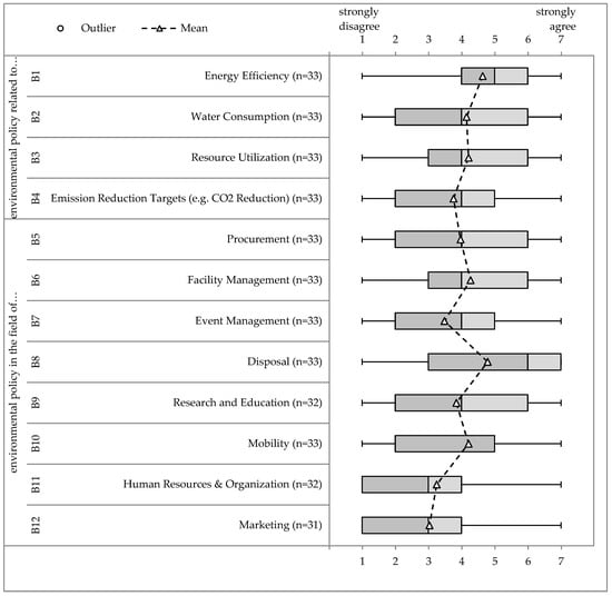 The first boxplot addressing environmental policy (see Figure 2) shows that energy efficiency is, on average, the most elaborated field of action (mean = 4.64). Policies concerning the reduction of emissions show a slightly below average level. The examination of water consumption and resource utilization deliver average patterns (mean = 4.15 and 4.21, respectively). Turning to HEIs’ environmental performance, policy issues concerning waste management show an above mean value (4.79). Considering also the median, disposal policy appears to be a well-elaborated topic. This may be due to legal requirements regulating such matters in German-speaking countries. Concerning mobility, the mean value is 4.21, which is below the median of 5, though the average performance is below average.