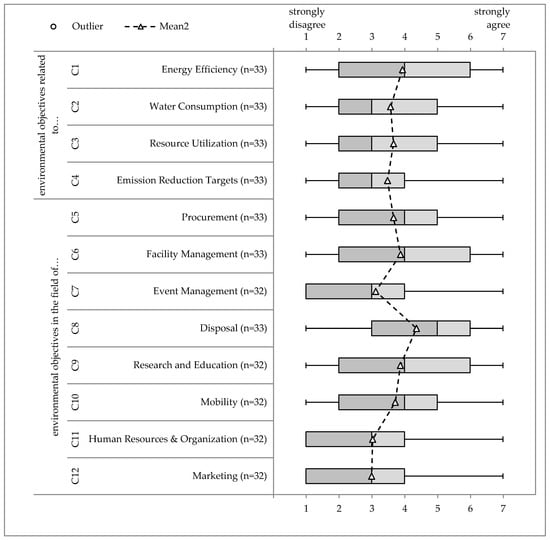 For the dimension of environmental objectives (see Figure 3), the measures of energy efficiency (3.94), water consumption (3.58), resource utilization (3.67), and emission reduction (3.48) show a level slightly below average. Consulting the median confirms the trend of a generally only medium adoption in practice. Finally, objectives on energy efficiency show the best average outcome, although the interquartile distance covers a broad range (values between 2 to 6). However, environmental objectives appear to be remarkably well-elaborated concerning disposal (mean = 4.36), as we can see the median reaching a high level (=5.00) compared to the other fields of action. Mobility objectives show a pattern similar to that of the policy dimension, since a mean value of 3.72 lies slightly below the median of 4.00. As was already observable for the dimension of environmental policy, marketing and HRM consistently show a low level of agreement (mean = 3.00 and 3.03, respectively). This becomes even clearer, since the lower quartile starts with the lowest value of 1 (=strongly disagree). Remarkably, event management shows almost similar values of agreement (mean = 3.13).