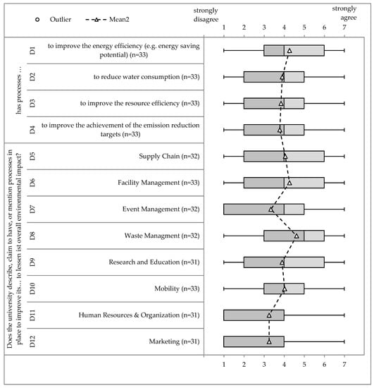 From the boxplot for environmental processes (see Figure 4), we can observe the highest approval rates for energy efficiency improvements (mean = 4.27), although only at a slightly better value. Processes improving the consumption of water (3.91), improving resource efficiency (3.85), or reducing emissions (3.79) show an average agreement. Looking at processes concerning environmental performance, they show a similar level of assessment. The mean values are located between 3.34 (event management) and 4.63 (disposal), which provide no considerable indications corresponding with our observations for the dimension of environmental objectives. The higher mean value and median for waste management again results from legal requirements which regulate mandatory waste disposal. The processes of mobility show a mean value of 4.03 corresponding to the median (value = 4.00). In terms of marketing and HRM, the low values (mean for both = 3.26) reveal a weak level of consent.