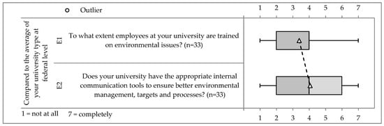 In total, the survey generated a response of 33 (GER: 27; AUT: 4, CH: 2) usable questionnaires, which were sent exclusively to state HEIs, resulting in a response rate of 9.7%. The response rate is hardly comparable with other studies as surveys in HE on the topic of sustainability are scarce. However, the findings show that sample selection bias is not a major concern [,], following the suggestions of Armstrong and Overton []. First, in Table 1 we first match the HEI’s characteristics of our sample with known attributes of the population (i.e., organizational size, country of origin, and type of HEI). HEIs with less than 7000 students are categorized as small, with at least 7000 and less than 24,000 students as medium, and with at least 24,000 students as large (similar to the classification of Burrell et al. []). Using a chi-square difference test, a significant difference in responses is only found for type of HEIs, which means that fewer universities of applied science and more universities responded than expected. Second, in Table 2 we compare latent variable scores between early and late respondents to test for non-response bias following the idea that “less readily” available responses (i.e., late respondents) are equivalent to non-responses. We define early respondents as those who answered at least with the first follow-up. No significant differences were found. For this reason, it is rather unlikely that there is a systemic bias on the basis of differences between early and late respondents. Nevertheless, we are aware of the relative low number of total responses as a limitation of our findings. Response rates around 10% can also be found in other recently published surveys (e.g., Guenther/Heinicke [] with 11.26%, Bisbe and Malagueno [] with 13.21%; de Geuser et al. [] with 9.5%; Libby and Lindsay [] with 13.6% and 1.5% response rate for two sub-samples). The decline in response rates is also reported in recent methodological papers (e.g., Hiebl and Richter []; van der Stede et al. []). Thus, we finally decided not to apply statistical tests in our Results section. For the Results section, we use boxplots to display the data of the survey more on an explorative level.