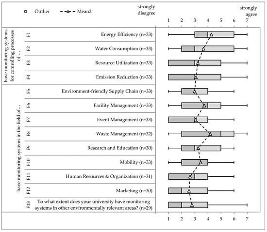The boxplot in Figure 6, for the dimension of monitoring systems for environmental management performance, indicates that HEIs mainly apply measurement tools for the case of energy efficiency (mean = 4.27). Here we can observe a slightly higher mean value than in other fields of action (water use: 3.67; resource use: 3.24; emission reduction: 3.09). The efficient use of resources, which includes tools for the reduction of emissions and the application of monitoring systems, appears to be slightly underrepresented. In both cases, the lower quartile starts with the value of 1 (=strongly disagree). Regarding the fields of action, HEIs, on average, perform best concerning disposal aspects. With a mean of 4.19 and a median of 5, again this appears to be the topic with the most emphasis, since regulatory requirements force HEIs to adopt certain disposal procedures. Interestingly, measurement tools for green procurement are obviously not in use, as the mean value of 3.00 indicates a general below average adoption. Similar to the low levels of agreement for the dimensions of policies and objectives, the assessment of monitoring for mobility issues is below average (mean = 3.45), which again is below the median of 4.00. Finally, event management (mean = 3.06), marketing (mean = 2.57), and HRM (mean = 2.65) consistently show the same below average performance as the other dimensions. In all these fields, the lower quartile begins with the value of 1 (strongly disagree) and ends with the value of 4 (partly agree). Especially for the case of marketing, the median shows a considerably low level (value = 2.00). The final question on environmental monitoring systems for other relevant fields of HEIs shows a low mean of 2.79.