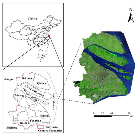 The Yangtze River estuary, one of the most famous coastal and estuarine ecoregions in the world, was selected as the study area. The region is located in East China, and the study area includes the Shanghai municipality and portions of Suzhou and Nantong in Jiangsu Province. The estuary extends from 30°33′ to 32°8′ N in latitude and from 120°50′ to 122°7′ E in longitude, covering an area of 13929.75 km2 (Figure 1). Topographically, the region is composed of plains, except for a few hills located in the southwest. The climate is a marine subtropical monsoon climate, where clouds are frequent during the entire year. The region covers complex urban impervious materials, cropland, forest, water body and grass, as well as a variety of wetlands. However, the Yangtze River estuary has become a vulnerable region due to intense human activities and uncertain climate change.