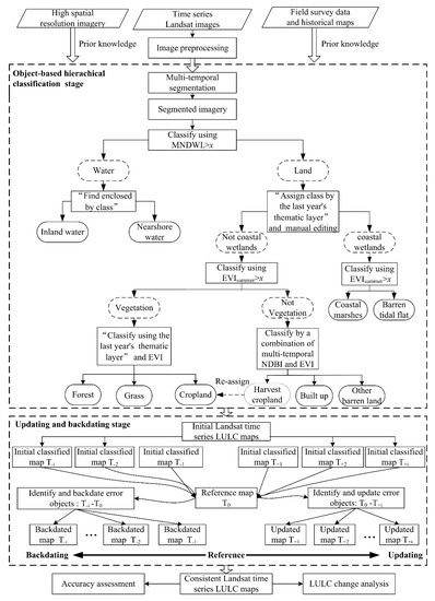 Figure 2. The designed framework that combines object-based image analysis, hierarchical classification, and updating and backdating approaches for LULC mapping in this study.